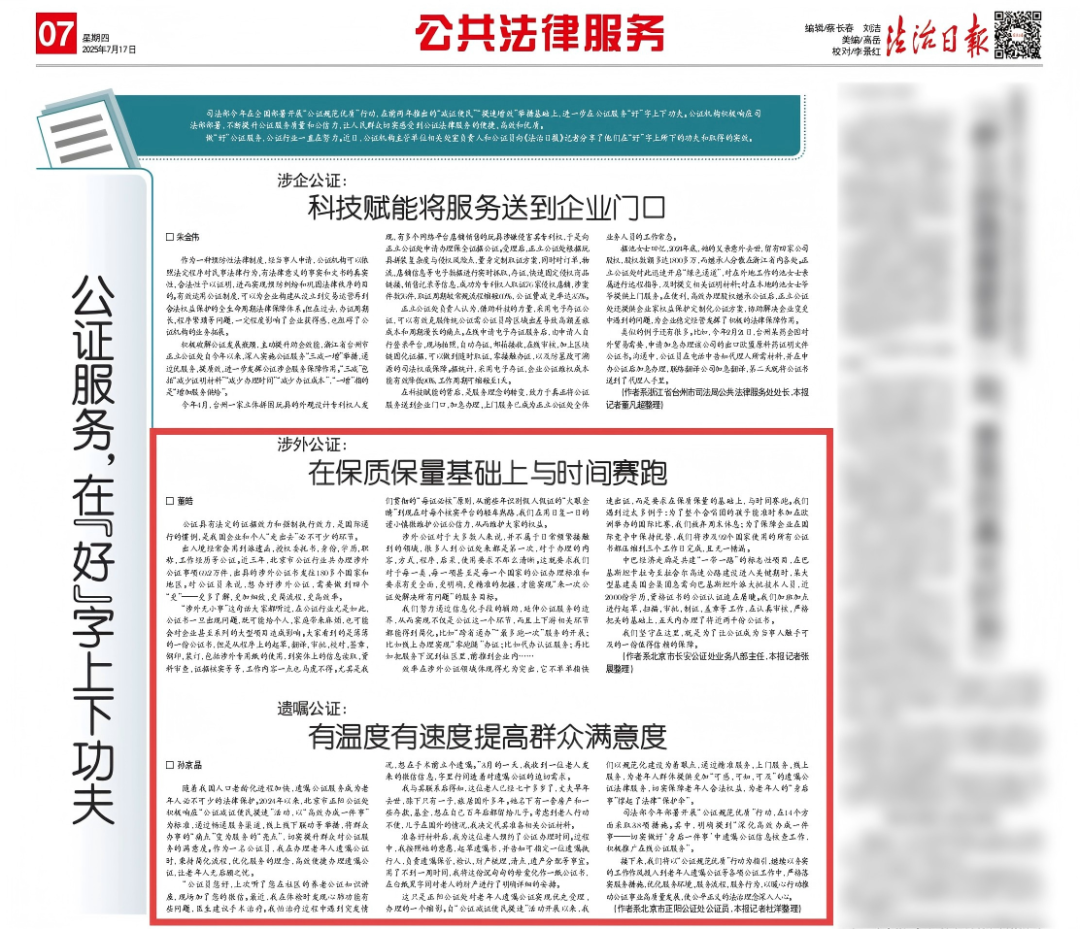此外,2025年8月,以《中华人民共和国公证法》颁布20周年为契机,加大宣传力度,相关成效获《人民日报》、央视新闻等主流媒体专题报道。