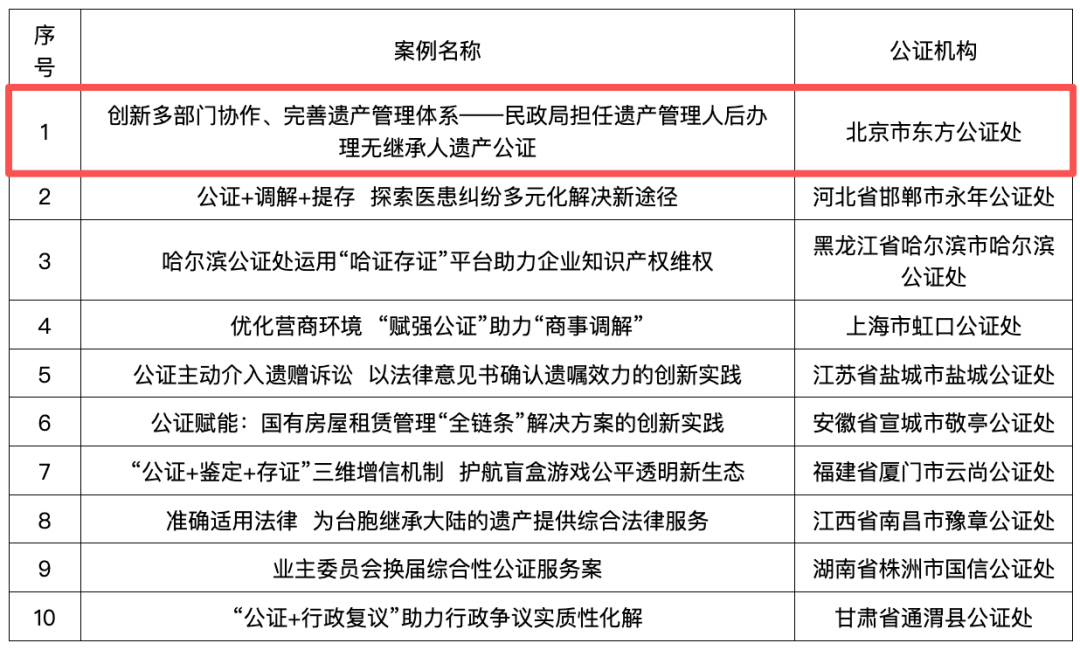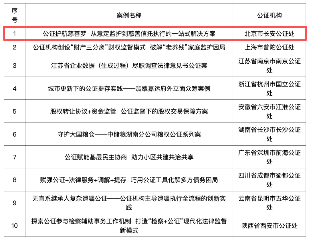 近日,湘潭大学司法部公证理论研究与人才培训基地发布2024年度中国公证十大典型案例。这些典型案例来自各地推荐的120篇案例,经公证行业专家与法学专家初评、终评以及评审委员会复核等程序,最终得以确定。其中,北京市长安公证处报送的案例被评为2024年度中国公证十大典型案例,北京市东方公证处报送的案例被提名2024年度中国公证十大典型案例。