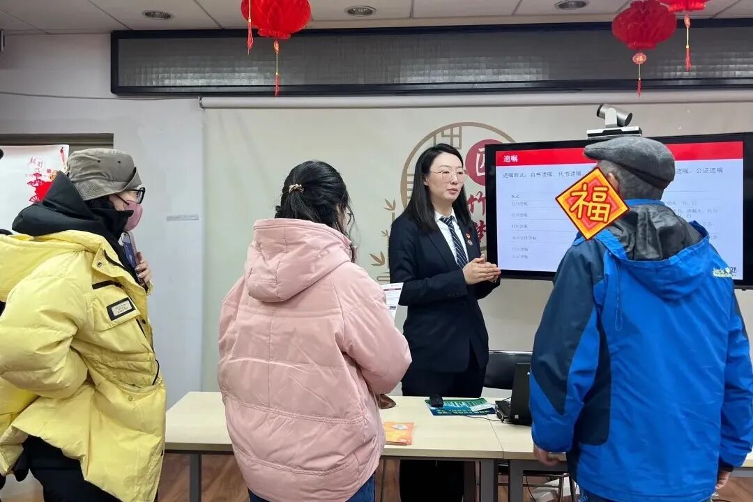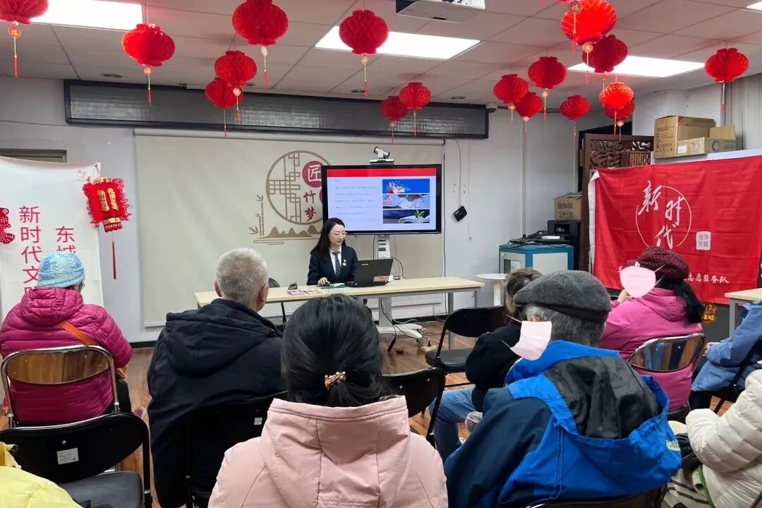 与此同时,在东城区竹竿社区,一场面向老年人群体的公益普法讲座也在热烈进行中。方圆公证处公证员朱青围绕家庭财产关系相关法律制度,为老年人们带来了一堂“干货满满”的法律课。