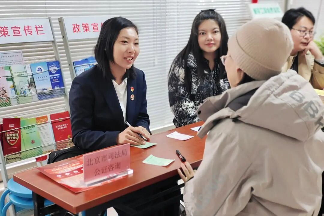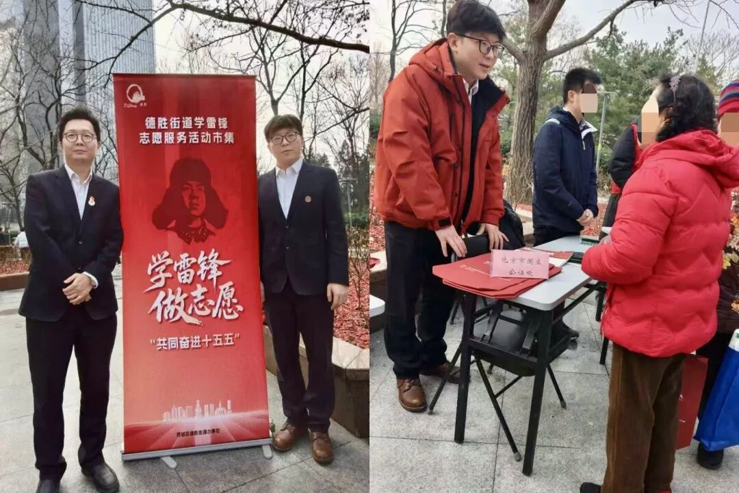 在西城区德胜街道玫瑰公园,一场热闹的志愿服务市集吸引了众多居民。国立公证处的“摊位”前,主任武斌和公证员林陆正耐心地为居民解答各类公证问题。
