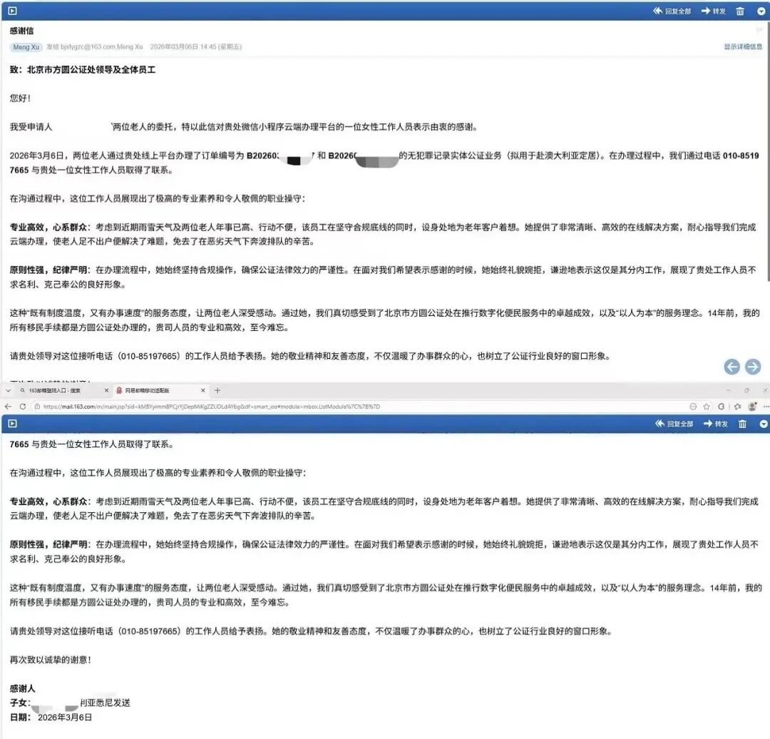 这种“既有制度温度,又有办事速度”的服务,深深感动了徐先生一家。徐先生在信中动情写道:“通过她,我们真切感受到了北京市方圆公证处在数字化便民服务中的卓越成效与‘以人为本’的服务理念。”